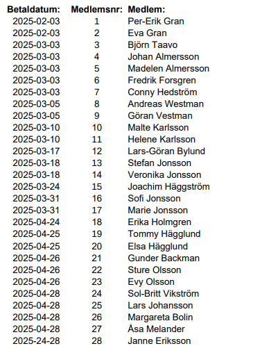 Årets, eller åtminståne de medlemmar som betalt medlemsavgiften på vårkanten. Medlemsnummer tilldelas i turordning när betalning registrerats hos banken. Uppdateras oregelbundet.